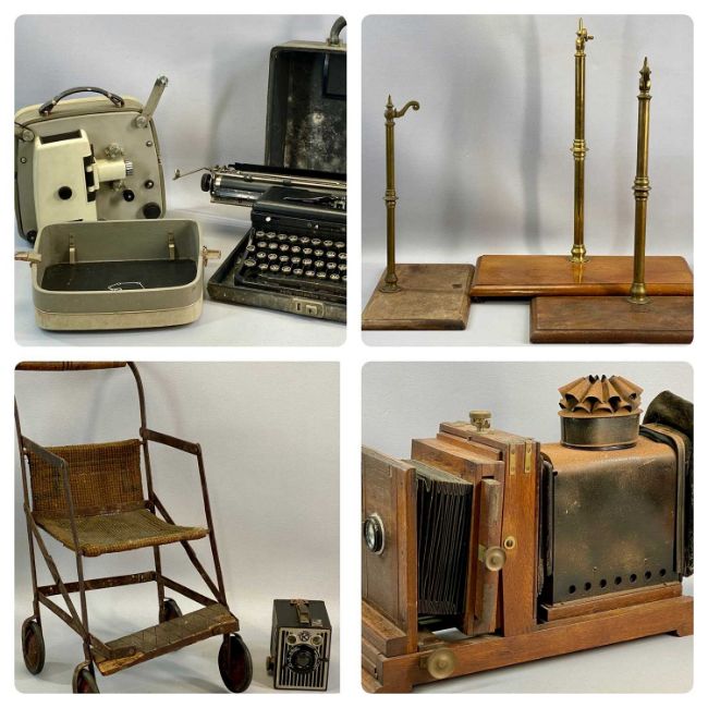 COLLECTABLES GROUP to include vintage 'The Salex Magic Lantern' with oak and metal case, vintage portable typewriter, Kodak 6-20 Brownie, three Victorian scale stands etc.Provenance: private collection Conwy