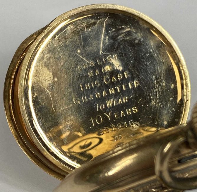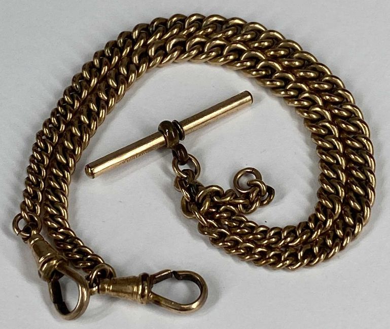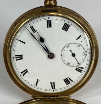 GOLD PLATED FULL HUNTER POCKET WATCH, keyless, white enamel dial with black Roman numerals and subsidiary seconds dial, 50mms (diam.) with a rolled gold double Albert chain with T-bar and clips, 37cms (l)Provenance: private collection Gwynedd
