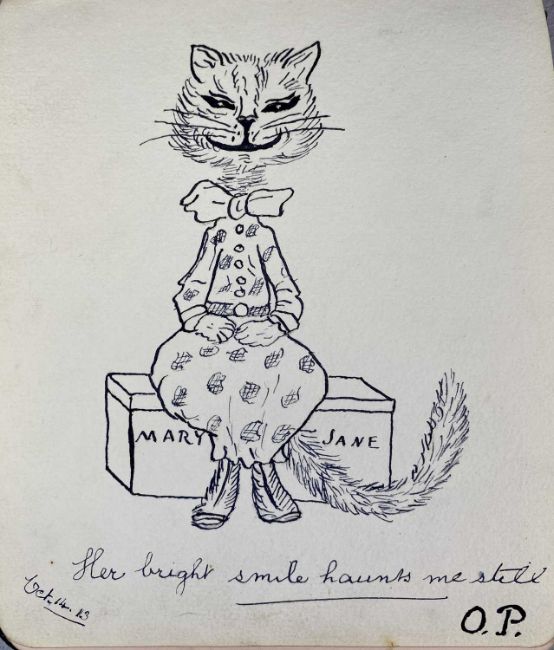 INTERESTING LEATHER BOUND AUTOGRAPH ALBUM, 1913 onwards, containing approx. 20 well executed miniature watercolour/pen drawings including topical cartoons and verseProvenance: private collection Denbighshire