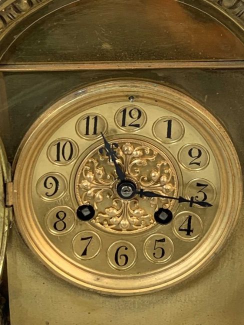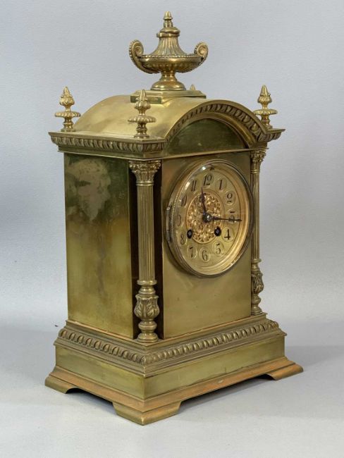 FRENCH GILT BRASS CARRIAGE CLOCK, late 19th century, the arched top surmounted with central urn shaped finial and four corner pineapple finials, circular gilded dial with Arabic numerals, flanked by reeded columns, 8-day movement striking on a gong, 37 (h) x 22 (w) x 15cms (d)Provenance: private collection Conwy