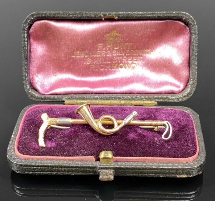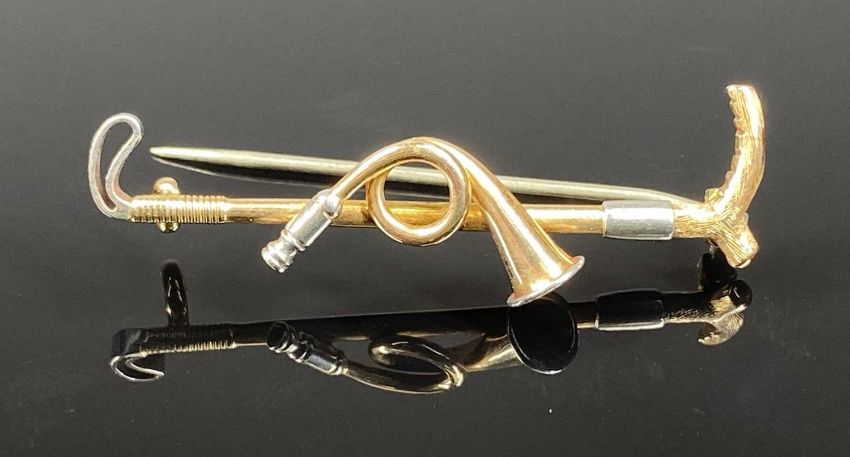 YELLOW/WHITE METAL BROOCH in the form of a riding crop and horn, in plush fitted case, unmarkedProvenance: private collection Conwy