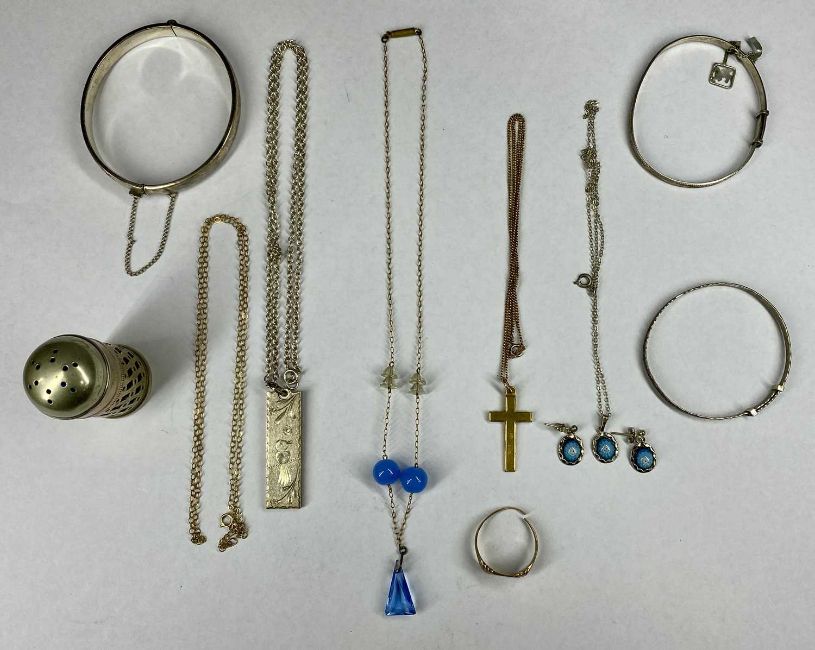 MIXED GROUP OF JEWELLERY including 9ct gold signet ring, 9ct gold crucifix and fine link chain, 7.8gms gross, a silver half ounce ingot pendant with chain, three silver bangles etc.Provenance: private collection Cheshire