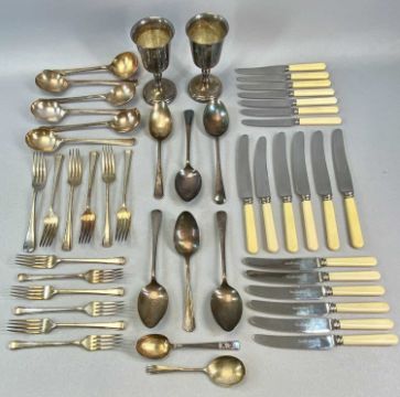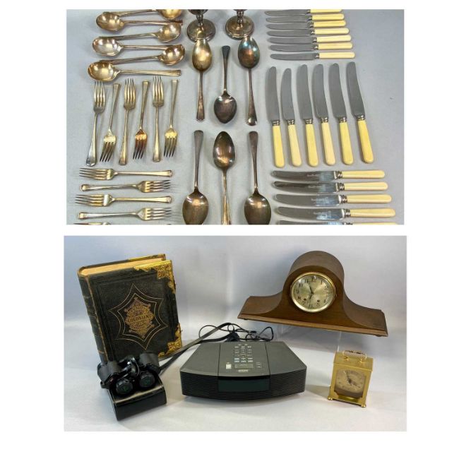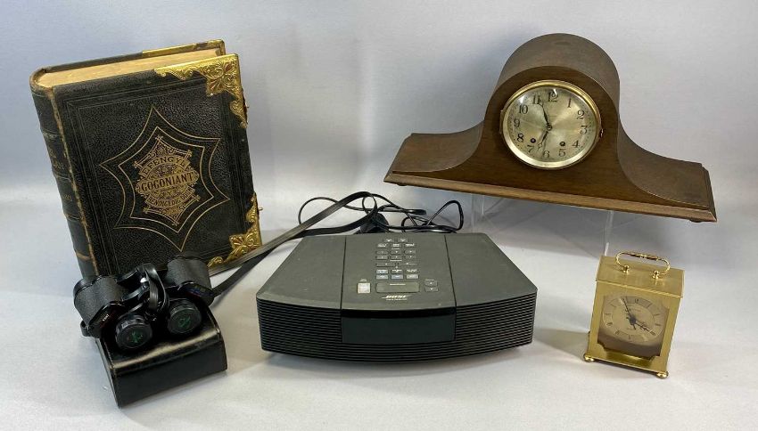 GROUP OF COLLECTABLES including a Bose Wave Radio CD model AWRC3G, leather bound Welsh bible with gilt metal fittings, dome top mantel clock, small quantity of cutlery etc.Provenance: deceased estate Ynys Mon