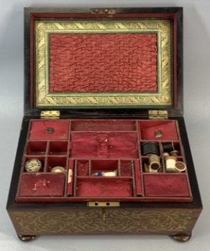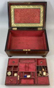 REGENCY ROSEWOOD & CUT BRASS INLAID SARCOPHOGUS FORM WORKBOX on bun feet, hinged cover enclosing fitted interior with lift-out tray, 19 (h) x 33 (w) x 22.5cms (d)Provenance: private collection Conwy