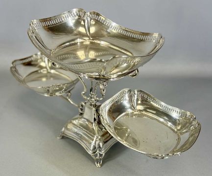 LARGE GEORGE V SILVER EPERGNE, central shaped rectangular bowl with pierced rim, smaller matching dish to either side, on wire frame, rectangular base with pierced supports, Sheffield 1919, 29cms (h), approx. 58ozProvenance: private collection Conwy