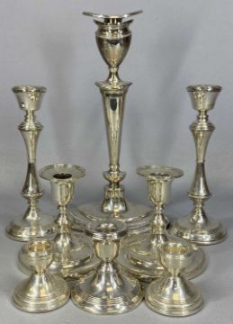 GROUP OF SILVER CANDLESTICKS WITH WEIGHTED BASES, classical style with oval base, Sheffield 1919, Walther Latham & Son, 30cms (h), a pair Sheffield 1981, 21cms (h), squat pair, Edinburgh, 11.5cms (h) and three othersProvenance: private collection Conwy