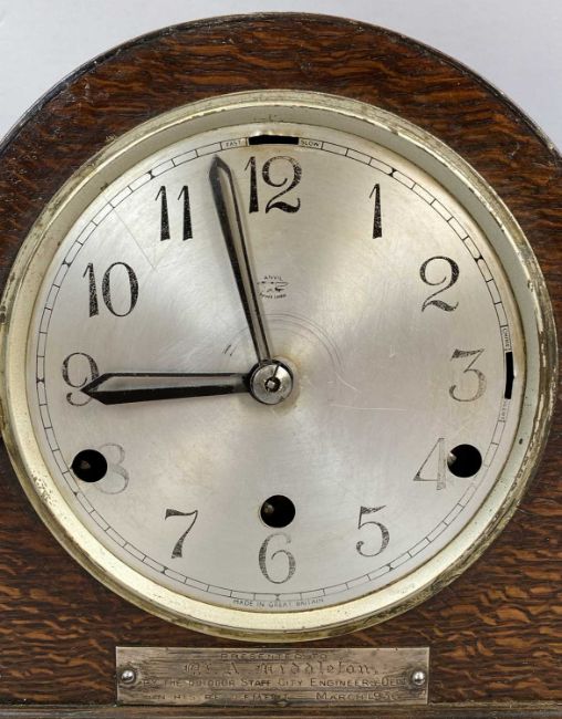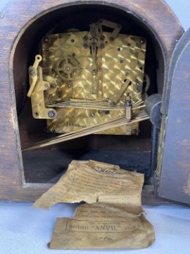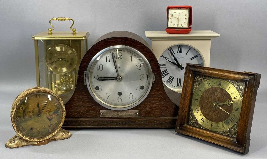 GROUP OF CLOCKS to include an Anvil oak cased dome top mantel clock, 23cms (h), gilt metal cased Anniversary clock, 22cms (h), Smith's square oak framed mantel clock, 16cms (h) etc.Provenance: private collection Conwy