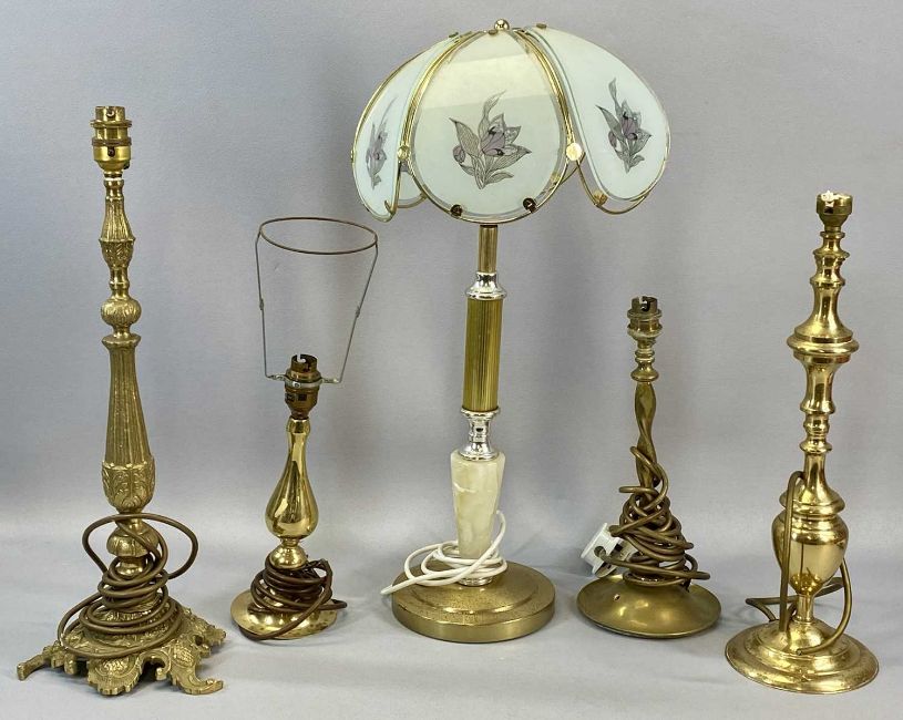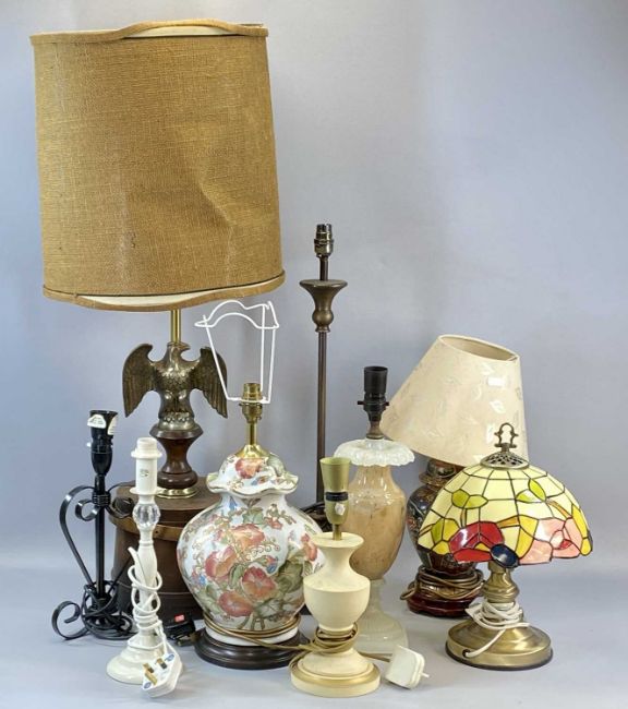 LIGHTING GROUP to include table lamps in various materials including ceramic and metal, etched green glass oil lamp shade, hanging pendant type ceiling light fitting and other itemsProvenance: private collection Conwy