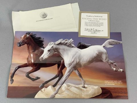 FRANKLIN MINT PORCELAIN EQUESTRIAN GROUP, 'Racing the Wind' by Pamela du Boulay, 26cms (h) with certificatesProvenance: private collection Cheshire