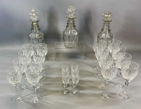 COLLECTION OF GLASSWARE to include three mallet shaped decanters with triple ring necks, various cut glass drinking glasses, ruby/cranberry glass to include claret jug, other jugs, posy vase and other itemsProvenance: deceased estate Ynys Mon