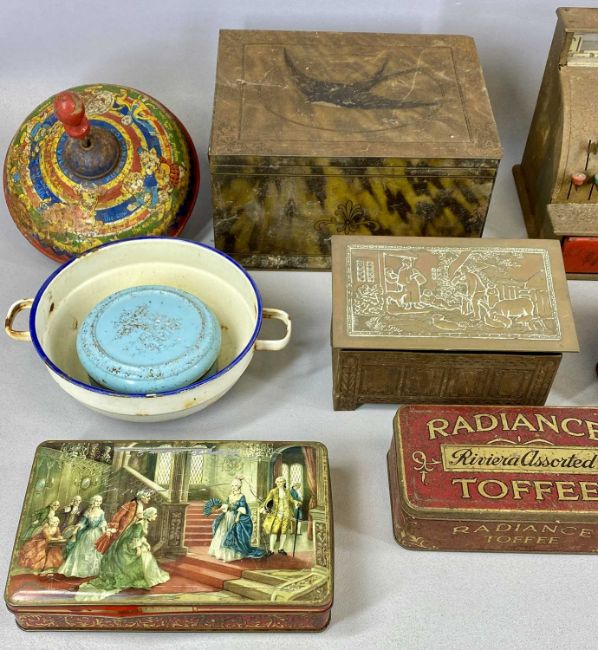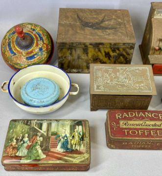 VINTAGE TOYS & COLLECTABLES including a Codeg child's till, Chad Valley tin plate spinning top, tins including Blue Bird Toffee and other itemsProvenance: private collection Conwy