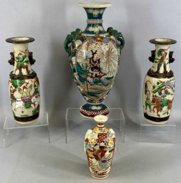 GROUP OF CONTEMPORARY CHINESE/CHINESE STYLE CERAMICS including blue and white garden/conservatory seat decorated with lotus scrolls, 42cms (h), a Famille Rose baluster vase and cover decorated with warriors, 47cms (h), three ginger jars and covers, 28cms the tallest, Satsuma crackle glazed vases decorated with warriors, 31cms (h), etcProvenance: private collection Conwy