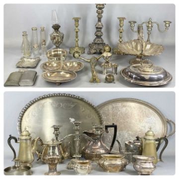 LARGE COLLECTION OF PLATED ITEMS including pair of Georgian style candlesticks, 25cms (h), oval swing handled basket, oval tureen and cover, two oval trays, oil lamp etcProvenance: private collection Conwy