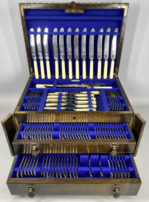 JAMES DIXON & SONS, SHEFFIELD, OAK CASED CANTEEN OF PLATED CUTLERY for twelve persons, approx. 104 pieces totalProvenance: private collection Conwy