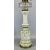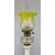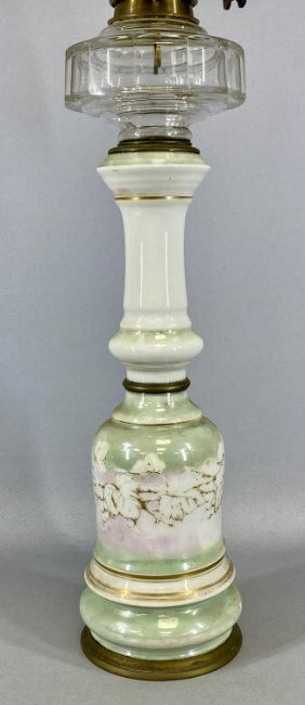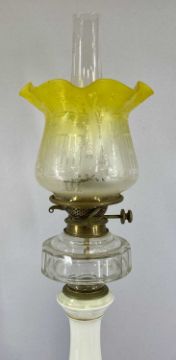 A VICTORIAN OIL LAMP having slender lustre glazed ceramic column, faceted clear cut glass reservoir, duplex single burner, etched clear and yellow glass shade with crimped rim, 72cms (h) excluding chimneyProvenance: private collection Conwy