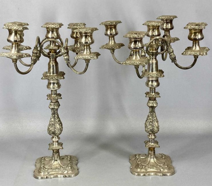 PAIR OF PLATED FOUR BRANCH CANDELABRAS with centre sconces, removable nozzles and repousse decoration, 46cms (h)Provenance: private collection Conwy