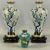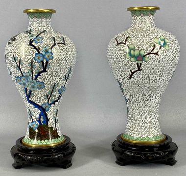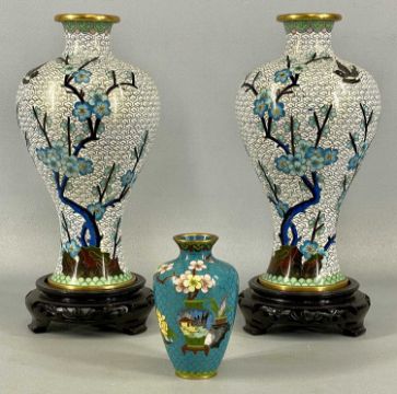 A PAIR OF CHINESE CLOISONNE VASES of slender baluster form, decorated with branches and birds on a white background on hardwood stands, 28cms (h) and a smaller vase decorated with a vase of flowering branches on powder blue ground, 10cms (h)Provenance: private collection Conwy