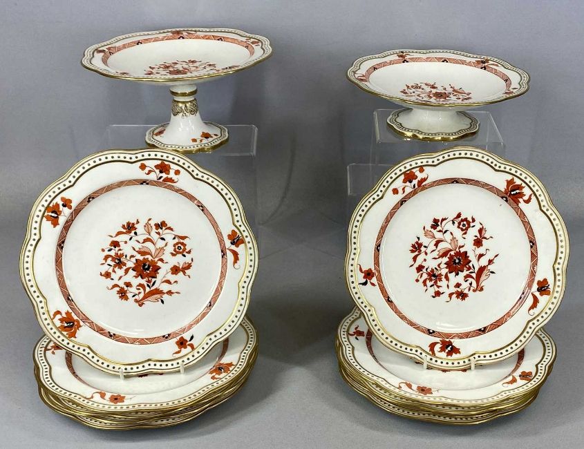 WEDGWOOD DESSERT SERVICE with rust floral decoration and gilded border including tall comport, 23.5cms (diam.), smaller comport, 23cms (diam.) and ten plates, 23cms (diam.)Provenance: private collection Conwy