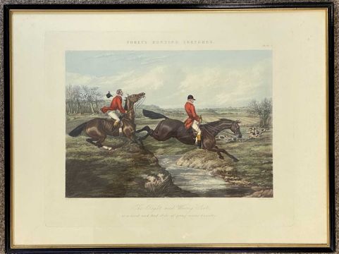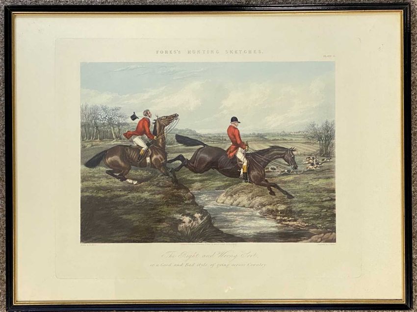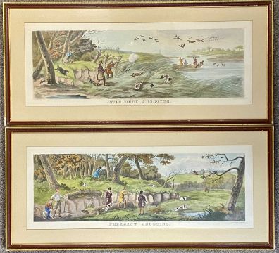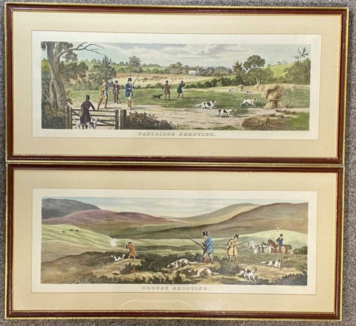 THOMAS SUTHERLAND (1735-1838) four coloured engravings - 'Grouse Shooting' published Ackermann, London, 26 x 71cms and two H. Alken engravings by J. Harris, 'Fores's Hunting Sketches: The Right and Wrong Sort', 42.5 x 57cmsProvenance: deceased estate CheshireComments: framed and glazed
