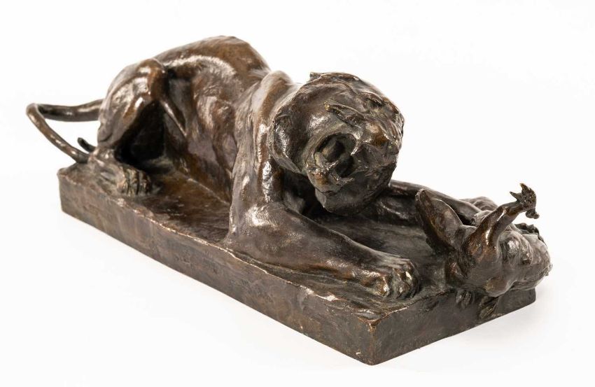 OSCAR WALDMANN (Swiss, 1859-1937) bronze - Tiger and Peacock on rectangular plinth base, signed, 38cms longAuctioneer's Note: exhibited at the sculpture event in the art competition at the 1924 Summer Olympics. Waldmann received an honourable mention at the Exposition Universelle of 1900 for his animal sculptures which were extremely popular due to their realism. Acclaimed by other exhibiting sculptors, including Gardet and Vibert, and by the general viewing public. His studio was located at 80 Avenue de Maine, Paris. In the 1920s he taught the African American sculptress Nancy Elizabeth Prophet at the Ecole des Beaux-Arts and also Katherine Elizabeth Wallis of Santa Cruz, California. In 1924 he exhibited a sculpture at the Olympic games. Waldmann was a regular exhibitor at the Royal Academy in London and at many exhibitions throughout Europe. His sculptures are highly prized among animalier collectors.Provenance: private collection Ynys Mon