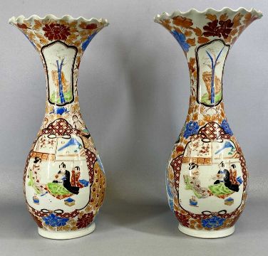 PAIR OF TALL 19TH CENTURY JAPANESE VASES, slender baluster form, flared crimped rims painted with butterflies, panels decorated with figures, 40cms (h)Provenance: private collection Conwy