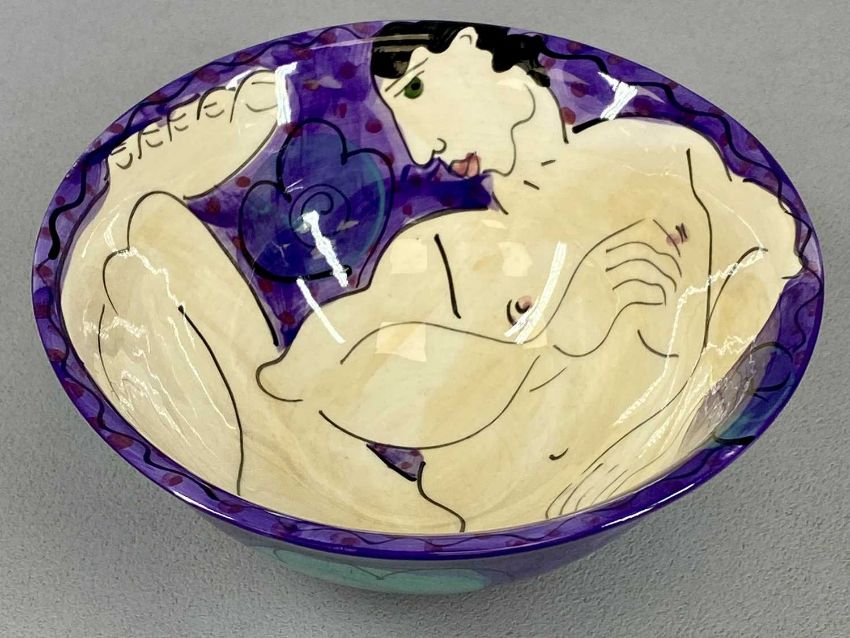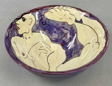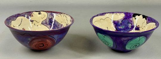 KAREN ATHERLEY (b. 1961) pair of ceramic bowls - painted with nude figures on a patterned blue ground, signed and numbered 96 to the bases, 17.5cms (diam.)Provenance: private collection Conwy