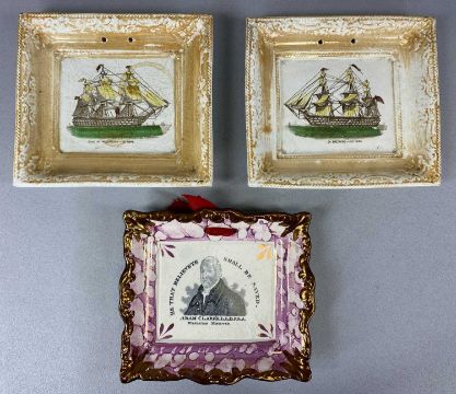 PAIR OF 19TH CENTURY STAFFORDSHIRE MARITIME PLAQUES, 'Duke of Wellington - 131 guns' and 'La Bretagne - 140 guns', 20 x 22.5cms together with Sunderland lustre plaque of Adam Clark, Wesleyan Minister 'He that believeth shall be saved', 19.5 x 21cmsProvenance: private collection Conwy