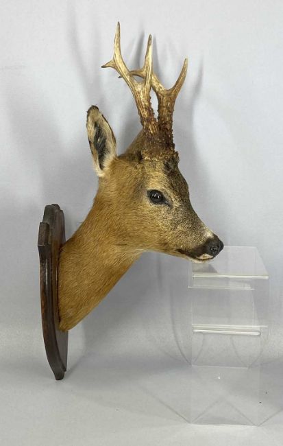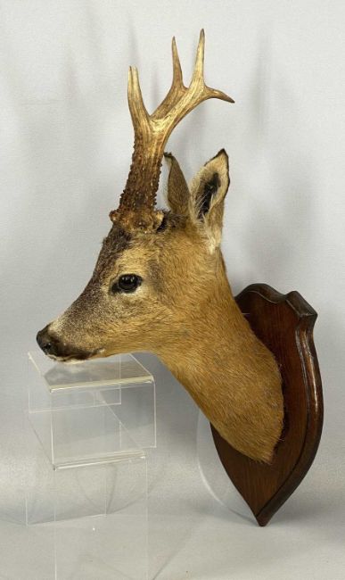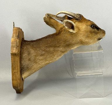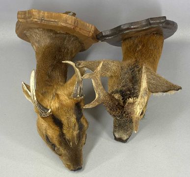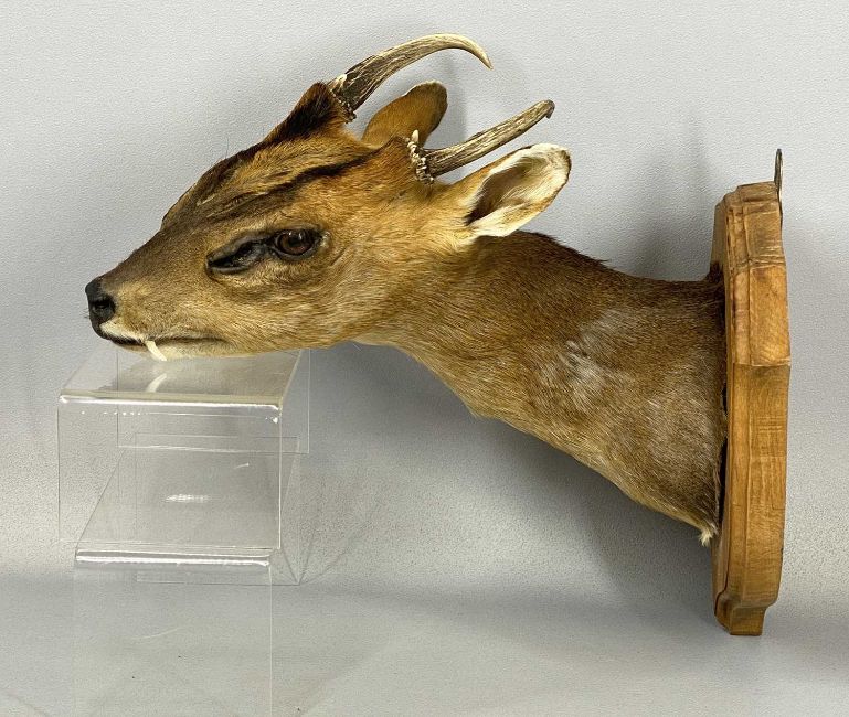 TWO TAXIDERMY DEER HEAD TROPHIES, neck mounts, wooden shields, Muntjac and RoeProvenance: private collection Conwy