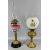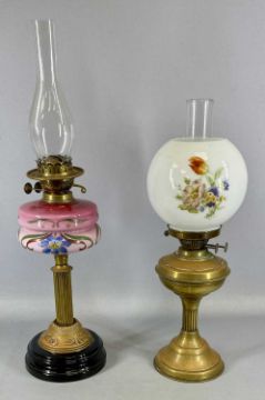 TWO VICTORIAN OIL LAMPS, one having black ceramic base, brass column, painted opaque glass reservoir and twin burners, the other having brass base column and reservoir, decorated globular opaque glass shade, 48cms (h) excluding funnel, both having twin burnersProvenance: private collection Conwy