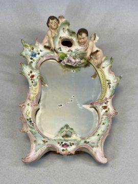 CONTINENTAL PORCELAIN ROCOCO FORM WALL MIRROR surmounted with two cherubs, 35 x 21cms and Continental gilt metal picture frame with transfer decorated porcelain mount, capped with a ribbon and with easel back, 32 x 23cmsProvenance: private collection Ynys Môn