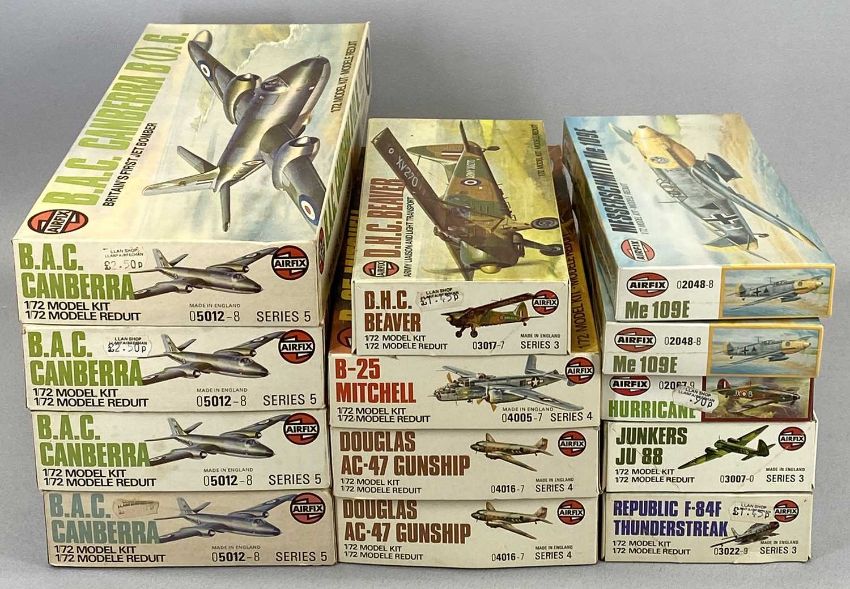 AIRFIX THIRTEEN BOXED PLASTIC MILITARY AIRCRAFT MODEL KITS including Hawker Hurricane Mk. 2, Douglas A47 Gunship, BAC Canberra, ME109E, contents appear complete but uncheckedProvenance: private collection Conwy