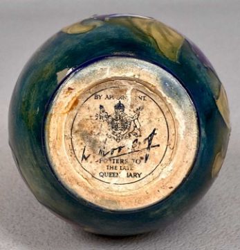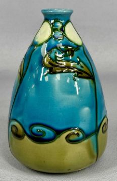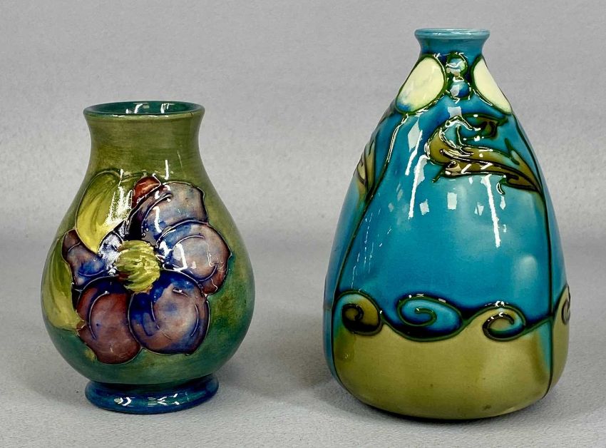 MINTON 'SECESSIONIST' BOTTLE SHAPED VASE, turquoise/green ground with tube lined stylised floral decoration, marked Minton Ltd. no. 31 on base, 12cms (h) and Moorcroft baluster form vase, green ground with original paper label, 9.5cms (h)Provenance: private collection Conwy