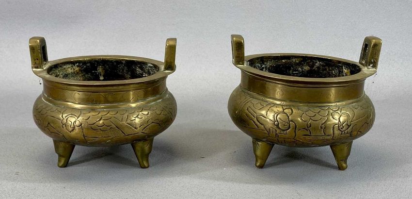 PAIR OF CHINESE BRONZE CENSERS, 19th century with side handles, engraved bodies, standing on three feet, seal marks to bases, 12cms (diam.)Provenance: private collection Conwy