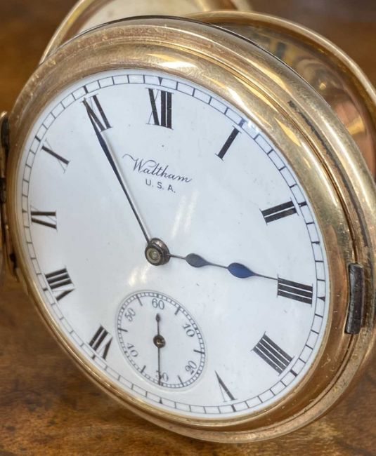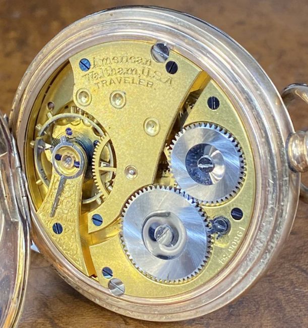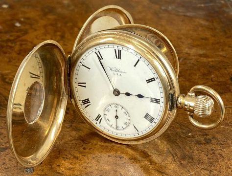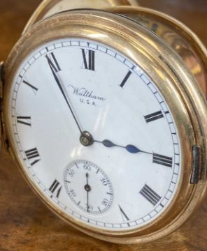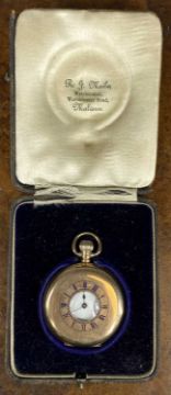 WALTHAM TRAVELER 9CT GOLD CASED HALF HUNTER POCKETWATCH, keyless, having white enamel dial, Roman numerals and subsidiary seconds dial, 50mm (diam.), 99.4gms gross, with fitted caseProvenance: private collection Denbighshire