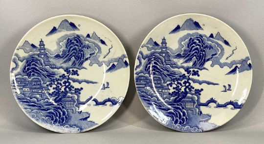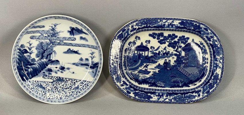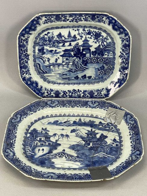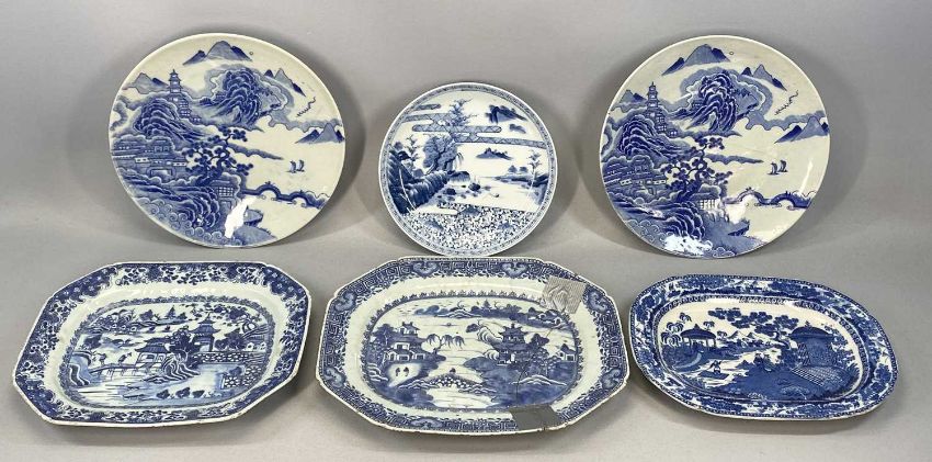 CHINESE CERAMICS including pair of Cantonese circular chargers decorated with landscapes, 31.5cms (diam.), export blue and white oval indented plate decorated with figures in garden, 23.5 x 31.5cms, similar larger plate etc. Provenance: private collection Conwy
