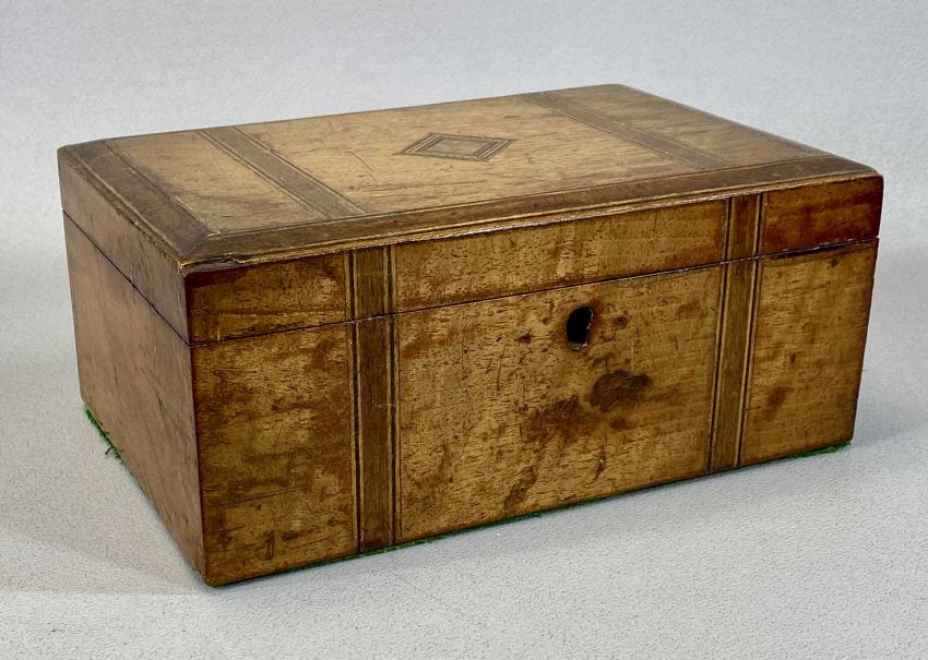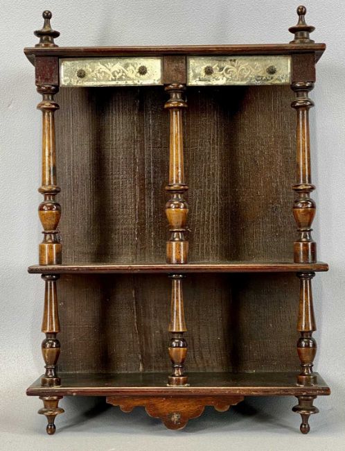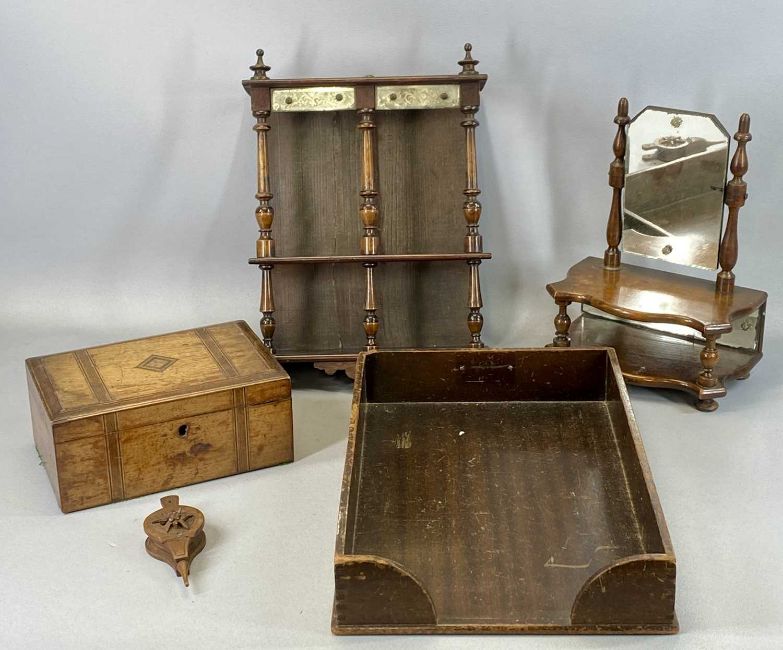 WOODEN ITEMS including small mahogany toilet mirror with swing plate, shaped two tier base with mirror back, 12cms (h), small mahogany wall shelf, 38 (h) x 27 (w) x 10cms (d), inlaid walnut trinket box, 10 (h) x 23 (w) x 15cms (d), carved oak fob watch holder in form of bellows and rectangular mahogany document trayProvenance: private collection Conwy