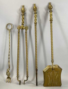 ANTIQUE BRASS & COPPER FIRESIDE ACCESSORIES including circular copper kettle with acorn finial, 30cms (h), three piece brass fire iron set with twist columns, brass toasting fork, copper saucepan with steel handle, 23cms (diam.) etc.Provenance: private collection Conwy