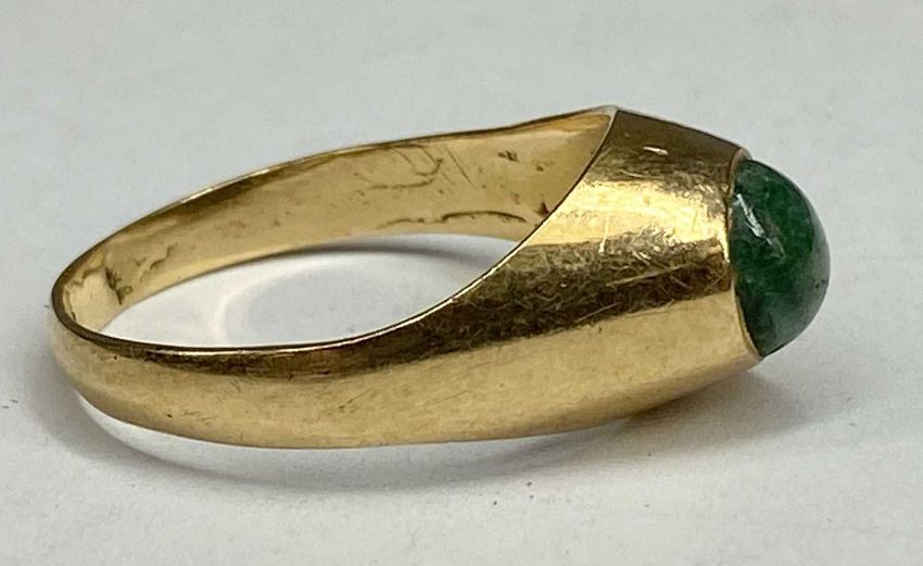 CONTEMPORARY YELLOW GOLD RING set with green cabochon stone, size P, 4gmsProvenance: private collection Ynys Môn