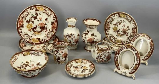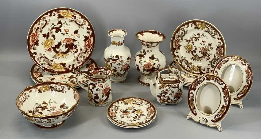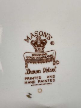 MASONS BROWN VELVET CHINA including circular footed bowl, 21cms (diam.), two oval photograph frames, 16.5cms (h), vase and various platesProvenance: private collection Gwynedd