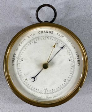 THREE MARINE INSTRUMENTS comprising late 19th Century brass encased aneroid barometer having white enamel dial, 12.5cms (diam.) excluding suspension ring, along with Sestrel brass case bulkhead barometer, 20.5cms (diam.) and FCC Precision quartz brass cased bulkhead clock, 19cms (diam.)Provenance: private collection Conwy