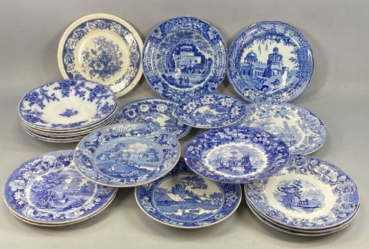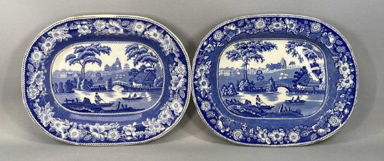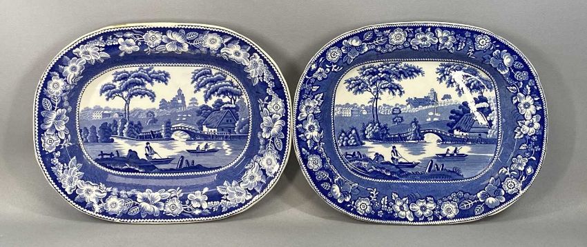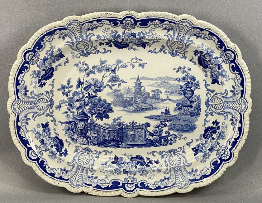 19TH CENTURY STAFFORDSHIRE BLUE & WHITE TRANSFERWARE including two Rogers 'Wild Rose' pattern indented meat plates, 32.5 x 41cms, larger Hicks, Meigh & Johnson indented meat plate with Chinese landscape, 42 x 55cms and various flatware Provenance: private collection Conwy