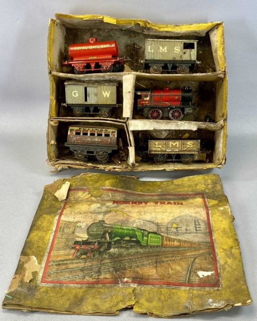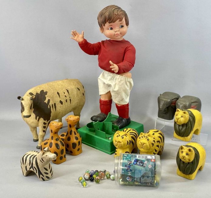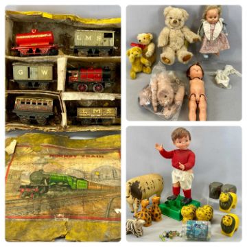 VINTAGE TOYS & COLLECTABLES including Geyper Gol mechanical footballer, 58cms (h), Hornby clockwork train set with locomotive and five carriages/wagons, group of painted wood Noah's ark animals, teddy bears including Steiff etc.Provenance: private collection Conwy