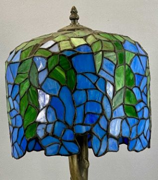 TIFFANY STYLE TABLE LAMP with naturalistic form metal base, blue and green leaded type shade, 55cms (h)Provenance: private collection Ynys Môn