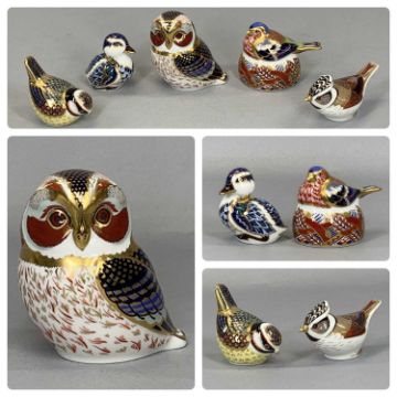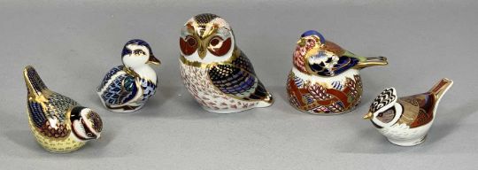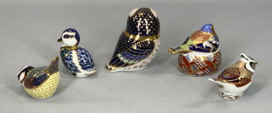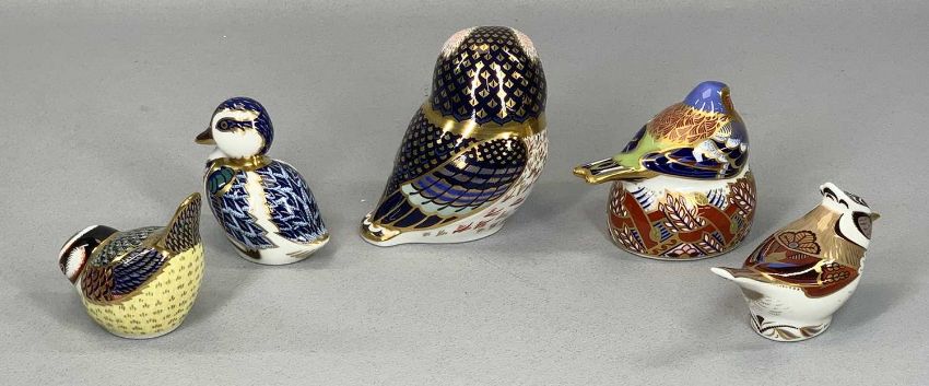 FIVE ROYAL CROWN DERBY BIRD PAPERWEIGHTS including 'Tawny Owl', 'Chaffinch Nesting', 'Duckling', 'Crested Tit' etc.Provenance: private collection Conwy