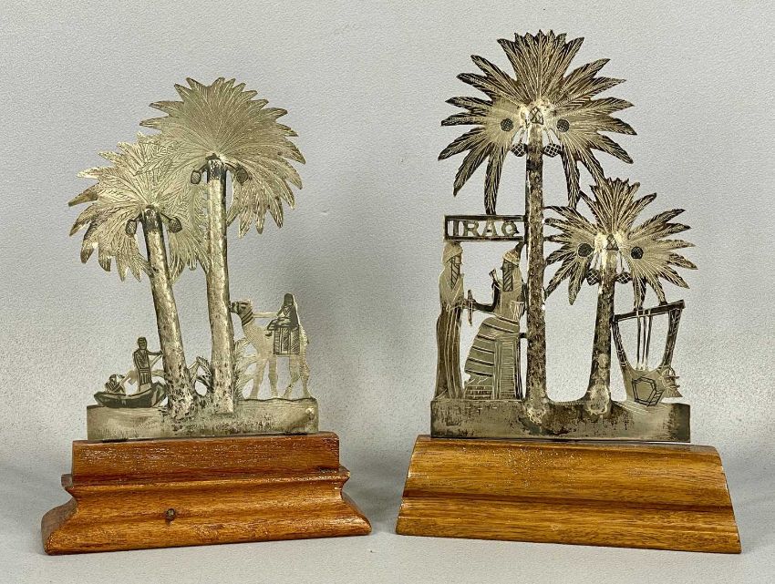 IRAQI SILVER NIELLO PALM TREE GROUP, 24cms (h), another similar 22cms (h) and two Chinese white metal paktong water pipes with engraved decoration, 31cms (h) the tallestProvenance: deceased estate Denbighshire