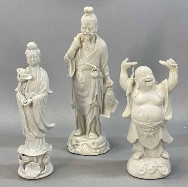 CHINESE FAMILLE NOIR BALUSTER VASE decorated all over with flowers and birds, 38cms (h), pair of Famille rose seated cats, 19cms (h) and three Blanc de Chine figures, 27cms (h) the tallestProvenance: private collection Conwy