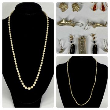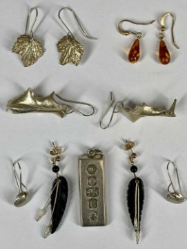 ASSORTED JEWELLERY including 1oz silver ingot, pair of amber earrings, three pairs of naturalistic design silver earrings, simulated pearl necklace with rose gold clasp etc.Provenance: private collection Conwy