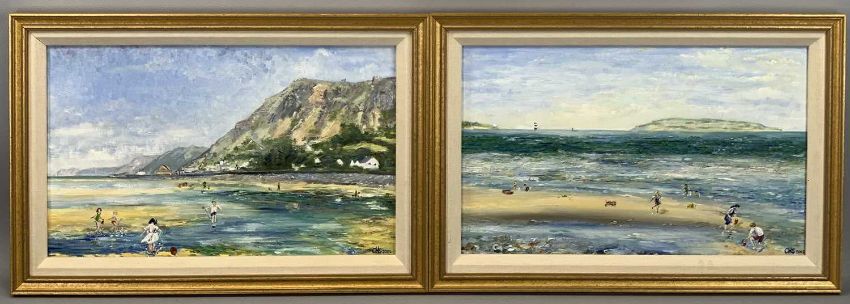 MODERN WELSH SCHOOL pair of oils on board - coastal views with children playing on beach in foreground, one showing Puffin Island and Penmon Lighthouse, monogrammed CHS, dated 2002, 24 x 39.5cmsProvenance: private collection DenbighshireComments: framed