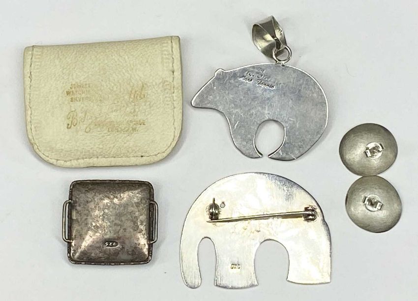 SILVER/WHITE METAL JEWELLERY including contemporary elephant brooch with textured finish, stamped 925, animal formed pendant with gold inlay, pair of concave earrings, brooch with butterfly wings under glass and three section neck collar Provenance: private collection Ynys Môn