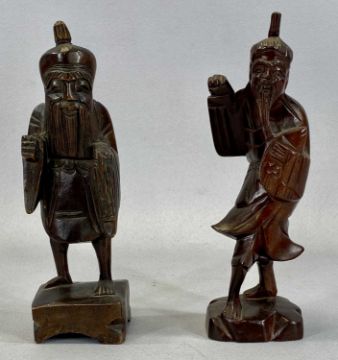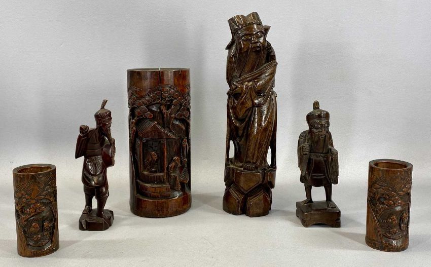 CHINESE CARVED WOOD ITEMS including bamboo brush pot, 25cms (h), pair of bamboo brush pots, 12cms (h), hardwood figure of wise man, 34cms (h) and two smaller, 21cms (h)Provenance: private collection Conwy